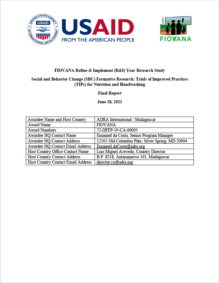 Social and Behavior Change (SBC) Formative Research: Trials of Improved Practices (TIPs) for Nutrition and Handwashing.